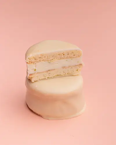Galleta de vainilla rellena de dulce de leche, bañado en chocolate blanco.
