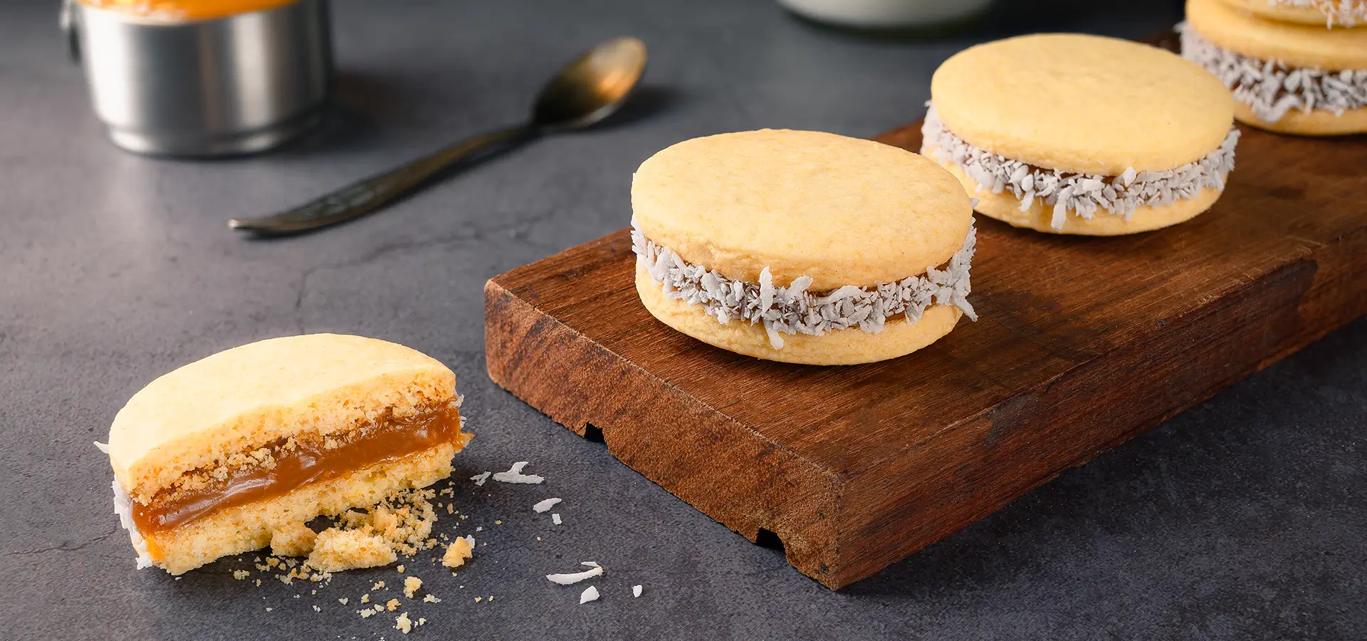 Suave galleta de maicena rellena de dulce de leche con corona de coco rallado.