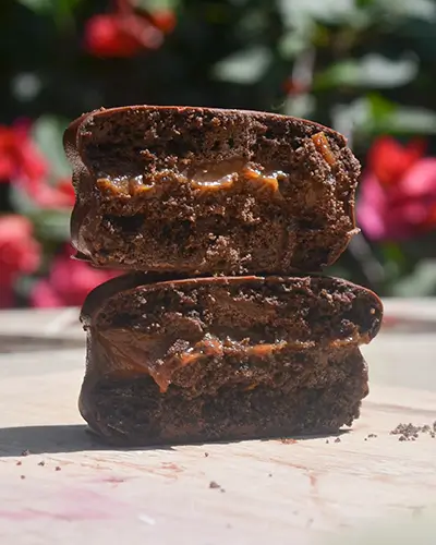Galleta de nuez con chocolate rellena de dulce de leche y trozos de nuez, bañado en chocolate 70%.